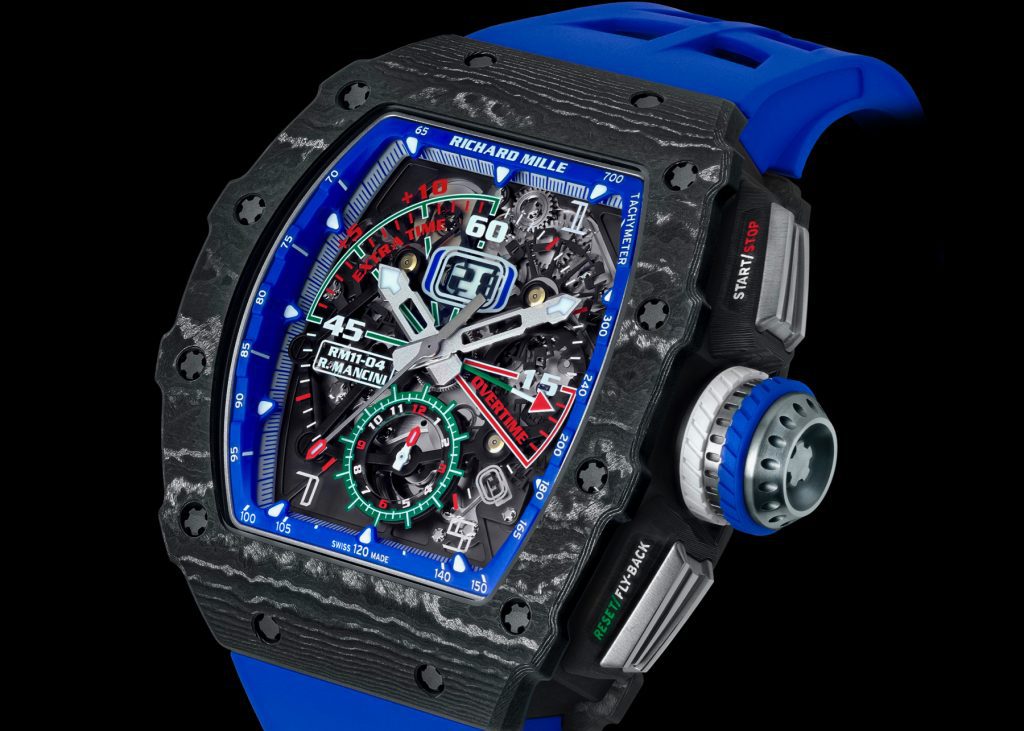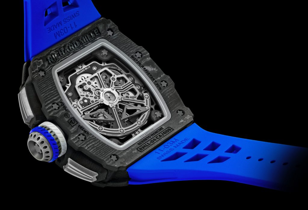 Sans rien perdre de l’ingéniosité de la RM 11-01, la RM 11-04 Roberto Mancini intègre les nouveaux codes stylistiques de la marque, visibles dans les lignes de sa couronne, de son rotor à géométrie variable ou dans son boîtier ultra sportif en Carbone TPT aux crénelures saillantes. Les nuances du drapeau italien «Il Tricolore» ainsi que le bleu, couleur officielle de l’équipe d’où le surnom de « Squadra Azzurra » présents tout autour de ce calibre automatique animant un chronographe flyback et un calendrier annuel, sont autant de clins d’œil aux origines de Roberto. Ils ornent le réhaut, la couronne, les cache-poussoirs et le bracelet caoutchouc doté d’une boucle déployante en titane.