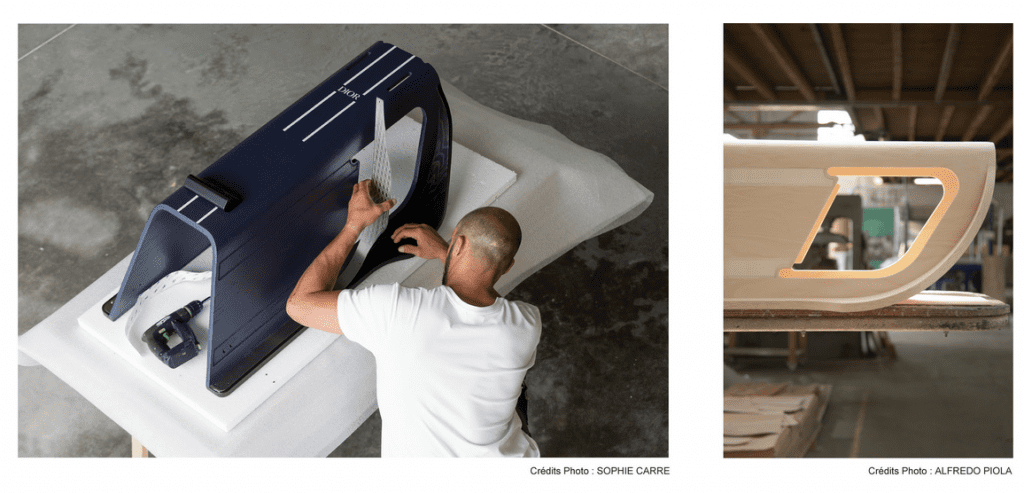 Cette luge est un alliage de savoir-faire traditionnels et de procédés ultra-modernes : pressage sous vide du bois lamellé collé, technologies de pointe (gravure chimique de l’inox, usinage numérique robotisé du bois). Les assises en linoleum (materiau d’orignie naturelle, consitué d’huile de lin et de poudre de liège) sont usinées numériquement du monogramme Dior. La corde d’escalade enroulée sur la luge, constitue une poignée dans les dévers, mais peut aussi être déroulée pour un usage longe de traction.