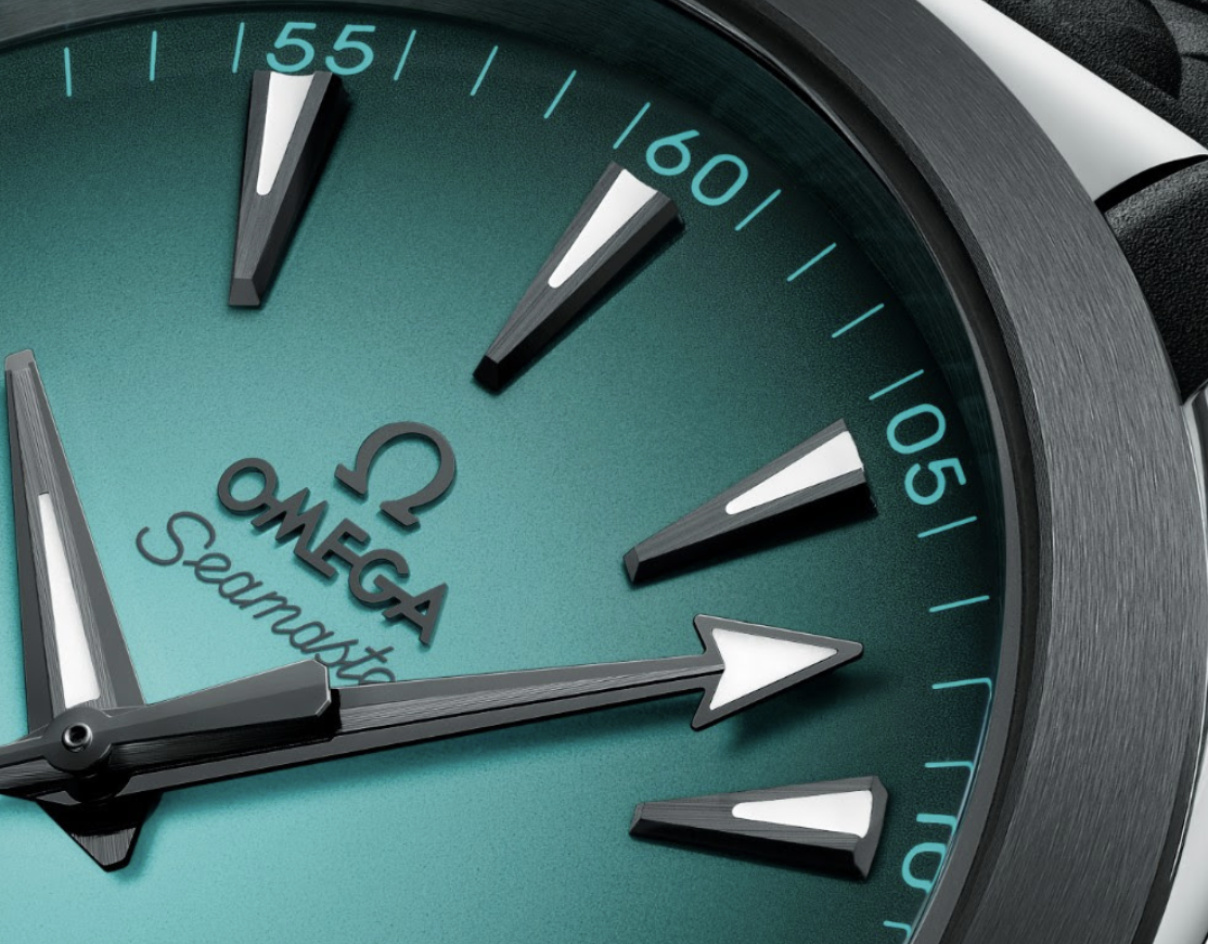 Chaque montre Aqua Terra se distingue par son cadran verni turquoise avec un effet dégradé noir, créant des couleurs qui changent comme la lumière du soleil filtrée par l’eau. La lunette en céramique mate noire [ZrO2] contraste avec le cadran laqué et poli. Les index et les aiguilles noirs revêtus de PVD sont remplis de Super-LumiNova blanche, émettant une lueur bleue dans l’obscurité. Le détail le plus remarquable reste la surpiqûre turquoise du bracelet noir en caoutchouc structuré intégré, qui établit un lien visuel marquant avec le cadran.