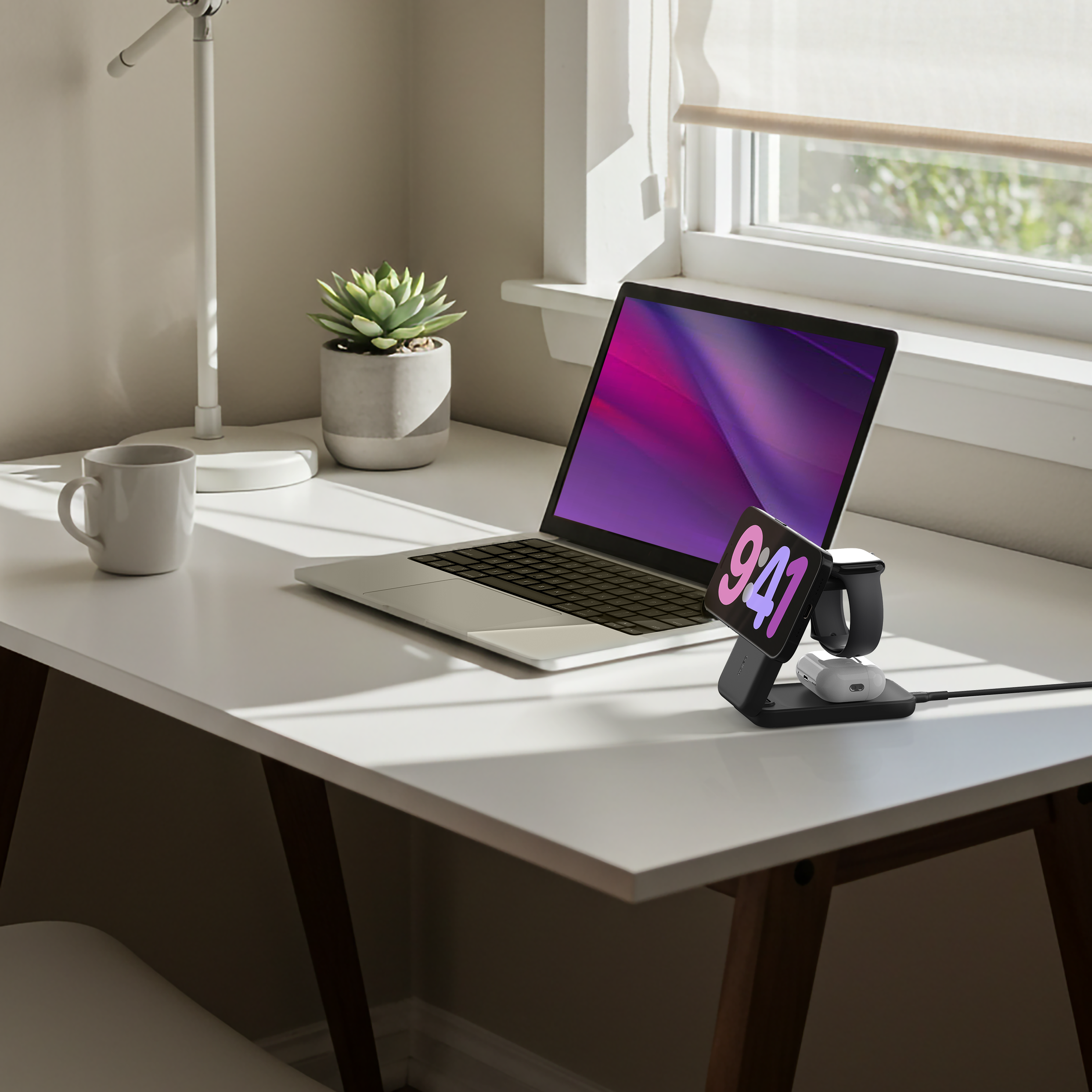 • UltraCharge Pro 3-en-1 Magnetic Charging Dock : Le plus rapide et le plus avancé, il charge l’iPhone de 0 à 50 % en seulement 25 minutes et l’Apple Watch de 0 à 80 % en 30 minutes, tout en alimentant trois appareils simultanément.