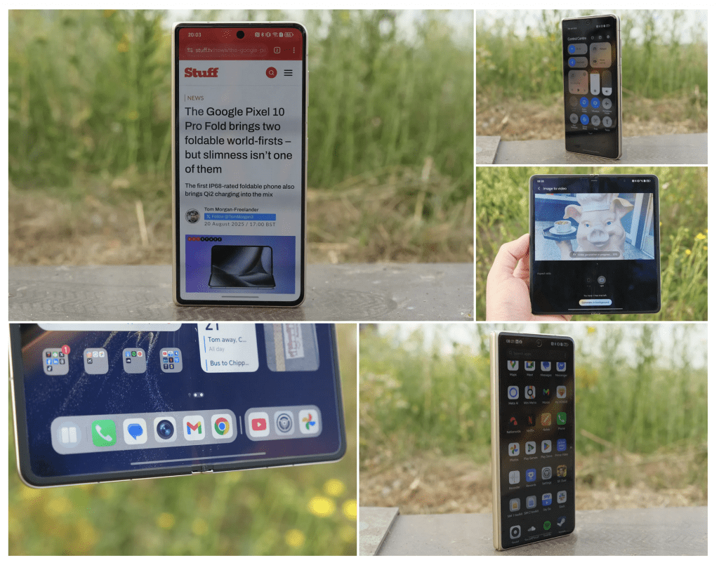 La réduction des bordures a permis de faire place à un écran OLED flexible de 7,95 pouces, contre 7,92 pouces sur le Magic V3. L’adepte de télé appréciera que son protecteur d’écran (non amovible) ne soit pas aussi réfléchissant que celui du Galaxy Z Fold 7, ce qui fait toute la différence pour regarder des scènes sombres, et qu’il offre une sensation de verre sous les doigts. Le pli est quasiment invisible, sauf si le soleil l’éclaire sous un angle idéal. Les deux écrans atteignent une luminosité maximale impressionnante de 5 000 nits en HDR ou Dolby Vision, et la visibilité en extérieur est exceptionnelle. Il est intéressant de noter qu’ils prennent tous deux en charge la saisie au stylet.