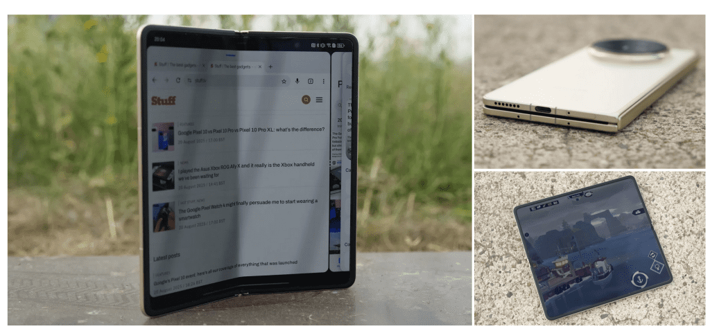 Passez du temps à faire du multitâche sur l’écran interne du Honor Magic V5 et vous apprécierez rapidement son mode d’écran partagé Multi-Flex. Il permet d’afficher trois applications côte à côte, deux d’entre elles dépassant des bords de l’écran pour laisser plus de place à celle qui est active. C’est bien plus flexible que le partage 50:25:25 plus rigide de Samsung. Le reste de l’interface de Magic OS, désormais en version 9, ne semble pas si éloigné des éditions précédentes. On retrouve un léger relent d’iOS dans les icônes, même nous sommes heureux d’annoncer que Honor n’a pas encore tenté sa propre version de Liquid Glass, et l’absence de tiroir d’applications (par défaut) signifie que les écrans d’accueil sont surchargés d’icônes.