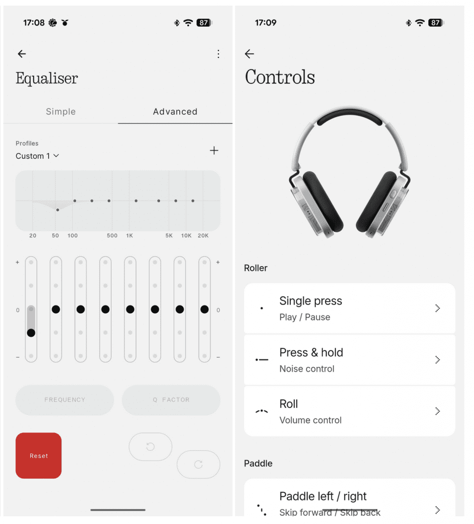 On apprécie que Nothing propose un égaliseur à deux niveaux en plus de sa gamme intra-auriculaire. Il dispose d’un simple curseur à trois voies pour les basses, les médiums et les aigus, ainsi que de quelques préréglages couvrant les bases ; les passionnés de casques audio devraient se tourner vers l’égaliseur avancé, qui propose un choix d’égaliseurs simple et avancé (8 bandes), la possibilité de créer plusieurs profils pour différents genres et un lecteur de code QR pour importer les réinitialisations créées par la communauté.