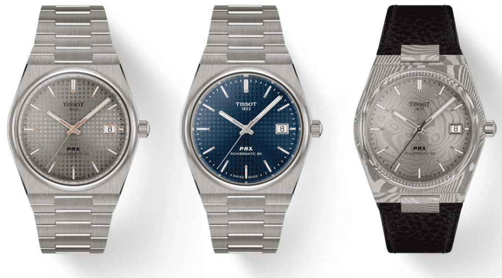 Le modèle en acier de Damas, quant à lui, est d’une toute autre nature. C’est la première fois que Tissot travaille ce matériau, réputé pour ses motifs ondulés distinctifs obtenus par le pliage de couches d’acier. Le résultat ? Une surface d’une beauté vivante : chaque montre est unique. Il est associé à un bracelet en cuir grainé et des embouts en acier de Damas. À l’intérieur, les trois modèles de 38 mm embarquent le mouvement Powermatic 80, éprouvé et fiable. Ce mouvement offre une excellente finition pour son prix et se révèle pratique, avec une réserve de marche de 80 heures et un spiral Nivachron résistant au magnétisme et aux chocs. Ajoutez à cela un verre saphir et une étanchéité jusqu’à 100 mètres, et la PRX reste aussi robuste que raffinée.