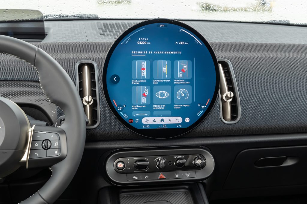 On retrouve forcément les bases des Mini modernes, avec un grand écran circulaire de 24 pouces concentrant l’essentiel des informations, et qui demande un peu d’habitude ; mais ensuite, entre l’affichage tête haute, le revêtement en tissu (micro-éclairé), la Mini Countryman, comme les autres modèles récents de la gamme, en met plein la vue. Ensuite, on trouve vite ses marques, avec une bonne position de conduite, une petite rangée de commutateurs (qui permet de sélectionner le mode de conduite Go Kart, amusant…) et l’on découvre, comme souvent sur les Mini, ce qui fait leur charme : un châssis précis (tout en étant moins ferme que d’autres modèles de la gamme) et une direction communicative, ce qui fait que l’on a peu d’engagement à la conduite, par rapport à d’autres « déplaçoirs » sans âme et sans saveur. Ajoutons un habitacle lumineux, un coffre au volume correct (460 l), une belle douceur de conduite au quotidien et des performances déjà suffisantes, et vous avez une auto électrique familiale très recommandable.