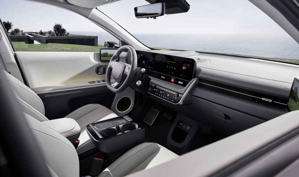 On est un peu dans la subtilité et l’essentiel est que la Ioniq 5 conserve cette silhouette atypique dans laquelle certains voient des influences des vieilles VW Golf I ou de Lancia Delta. La Ioniq 5 est une auto qui en impose par ses proportions, avec des dimensions qui, là aussi, sortent un peu du tout-venant automobile : 4,66 m de long, 1,89 m de large et 1,65 m de haut. On note toutefois que la Ioniq 5 a bénéficié de quelques évolutions esthétiques à l’avant (bouclier, éclairage) ainsi qu’à l’arrière (aileron). Elle dispose aussi de nouvelles jantes. Par ailleurs, des rétroviseurs par caméra sont disponibles en option et notre auto d’essai en bénéficiait. Si l’on reconnait leur apport (l’image est plus claire et plus nette quand les conditions de luminosité ne sont pas bonnes, comme la nuit ou sous la pluie, mais on ne peut plus conduire le coude à la portière et on a parfois du mal à situer l’endroit où sont les motos en interfile). Ces rétroviseurs aident également à l’efficience aérodynamique.