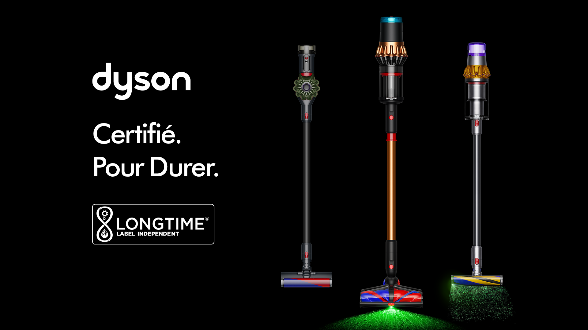 Les modèles Dyson V16 Piston, Dyson V8 Cyclone et l’ensemble de la gamme Dyson V15 (Detect Absolute, Fluffy, Origin, Submarine) portent dès à présent le label LONGTIME en France. D’autres produits Dyson seront labellisés prochainement.
