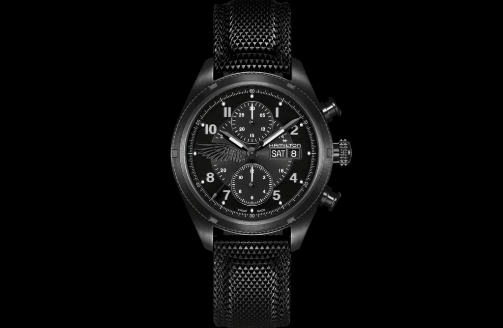 La couronne rappelle la molette de réglage d’une lunette de sniper, tandis que les poussoirs évoquent des cartouches de balles. Un symbole d’aile à 9 heures sur le cadran (reflété sur le fond du boîtier) rend un hommage discret aux camarades tombés au combat, dans un monde où la survie n’est jamais acquise.