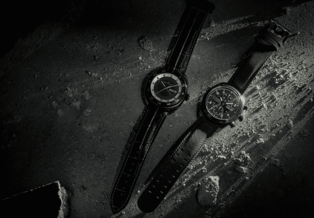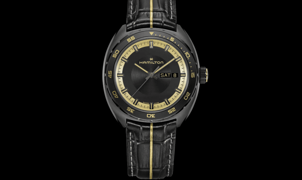 La montre de Grace, quant à elle, adopte une approche très différente. Elle évoque davantage l’intelligence et la subtilité que la force brute. Le coloris noir et or, que Hamilton nomme « or et noir », se retrouve sur le cadran, la lunette et le bracelet, avec des détails géométriques sur le fond du boîtier. Toujours aussi fonctionnelle, cette montre se distingue par son raffinement, reflétant le rôle plus analytique de Grace dans l’histoire.