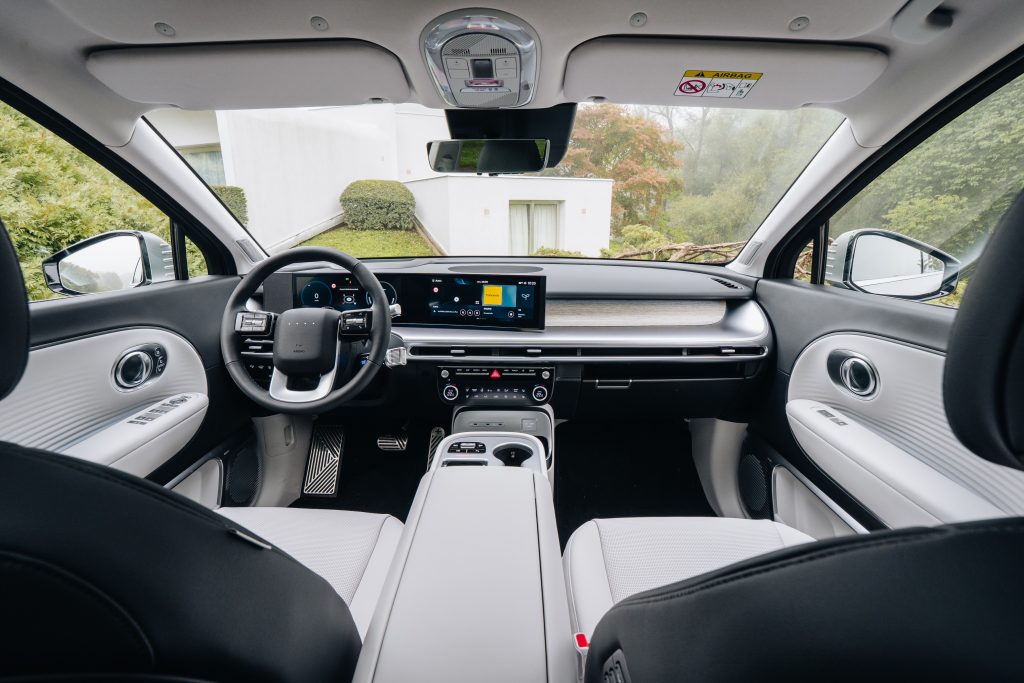 Nous avons eu la chance de découvrir la Ioniq 9 en version haut de gamme appelée Calligraphy (clin d’œil subliminal aux versions Autobiography chez Range Rover, probablement). Quoi qu’il en soit, l’appellation est justifiée, car dès que l’on ouvre la porte, c’est le choc devant l’excellence de la finition et la qualité des matériaux, qui n’a rien à envier au meilleur du premium allemand ; on loue la qualité des cuirs, de l’aluminium, des assemblages. Ensuite, l’espace à bord est gigantesque, encore plus dans la version qui dispose de deux fauteuils individuels au second rang, qui sont pivotants, de surcroît. Le coffre peut atteindre jusque 2494 litres et cette auto se destine avant tout à ceux qui aiment être à l’aise aux entournures, ce qui n’est pas un défaut, bien au contraire. En tous cas, c’est indubitablement une sensation haut de gamme qui prédomine lorsque l’on est à bord. La Ioniq 9 est également très techno : fonction V2L, stationnement opérable à distance via commande keyless, rétroviseurs par caméra, 6 ports USB à l’intérieur, boîte à gants avec désinfection par UV-C, sans compter le reste, volant et sièges chauffants ou ventilés, sièges massants, excellente sono, et on en passe. Bref, le positionnement haut de gamme de l’auto ne fait aucun doute. L’ergonomie de tout le système d’info-divertissement est plutôt bonne.