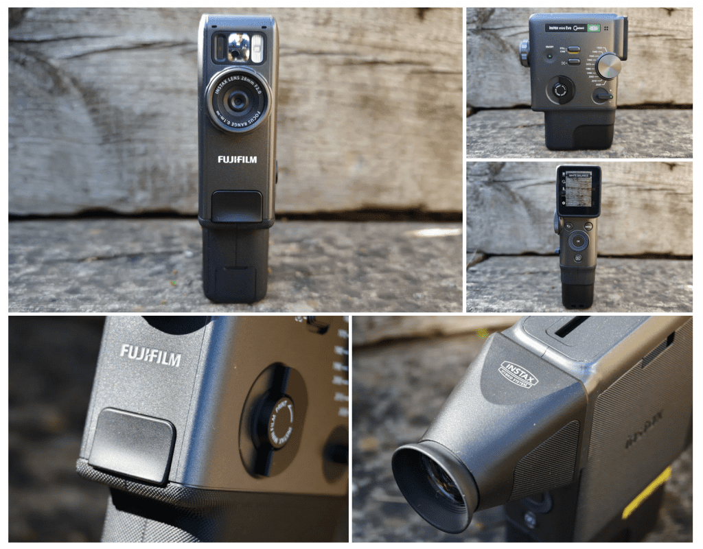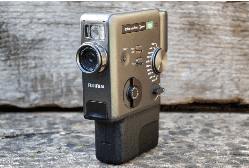 Seuls les historiens de la photographie reconnaîtront que l’Instax Mini Evo Cinema est basé sur le Fujica Single-8 de 1965. Il en reprend la poignée verticale, avec une série de cadrans et d’interrupteurs d’époque sur un côté, mais un viseur LCD plus moderne à l’arrière. Les packs de films Instax Mini — toujours les plus répandus et les plus abordables — se chargent dans un tiroir sur le côté opposé.