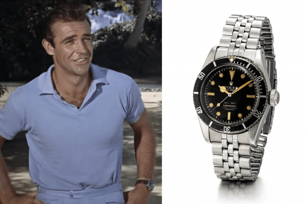 Pour sa première apparition sur grand écran, James Bond portait une Rolex Submariner, référence 6538, connue sous le nom de “Big Crown” (Grosse Couronne). C’est une montre de plongée assez classique, dotée d’un cadran noir et d’une lunette assortie avec un triangle rouge à 12 heures — et sans aucun gadget de la part de Q. Ceux-là sont arrivés plus tard.