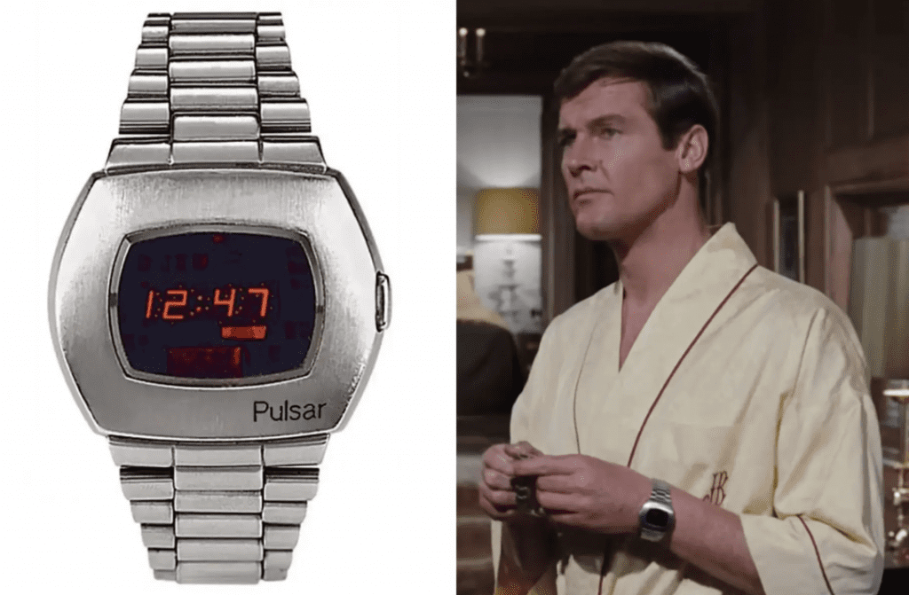 À deux reprises durant le film, nous avons droit à un gros plan de Roger Moore démontrant que l’heure n’apparaît qu’en pressant un bouton, ce qui illumine l’écran LED. Contrairement aux montres numériques ultérieures, la Pulsar P2 était un garde-temps simple, n’affichant que les heures et les minutes, sans date, chronomètre ou autre complication.